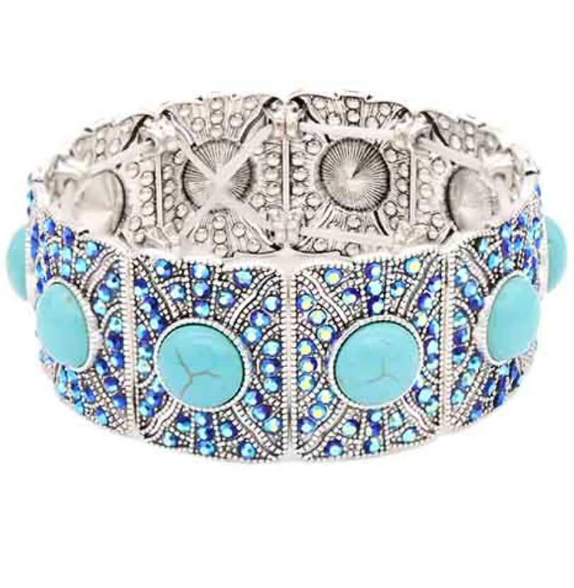 This elegant SILVER TURQUOISE STRETCH BRACELET is crafted using high-quality silver and features beautiful turquoise gemstones. The stretch design allows for a comfortable fit for all wrist sizes. Add a touch of sophistication to any outfit with this stunning bracelet.