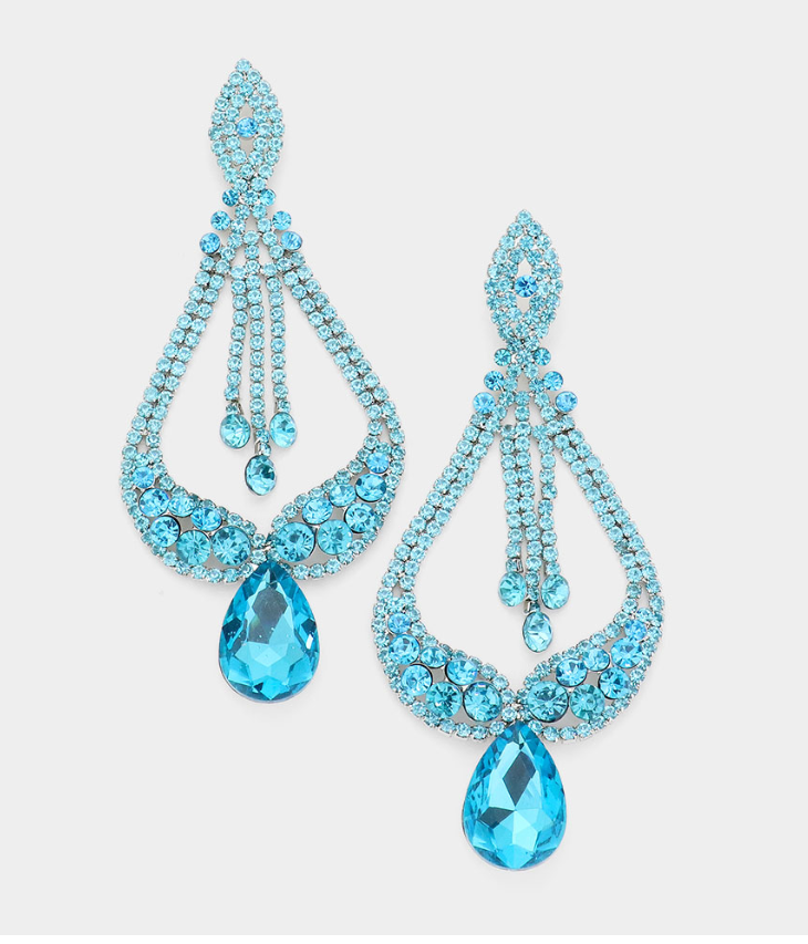 Enhance your evening look with our oversized pave glass teardrop chandelier earrings. Measuring 2.25" by 5.25", these elegant earrings are designed with a post back for secure wear. Elevate your style with the timeless sparkle of these stunning earrings.