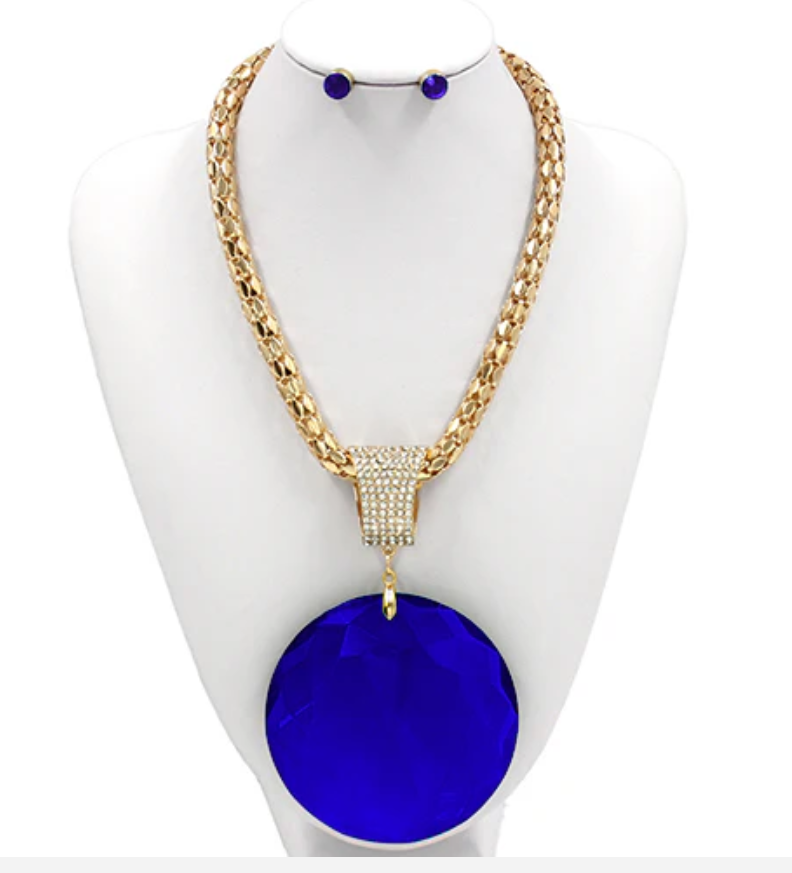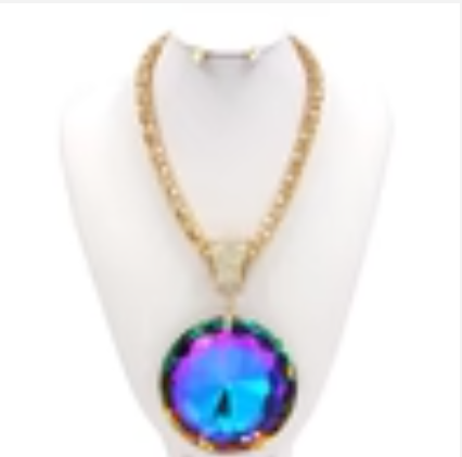 This stunning gold necklace set features a large, sparkling stone that will add a touch of elegance to any outfit. Made with high-quality materials, this necklace is durable and long-lasting. Elevate your style with this beautifully crafted piece. (Various Versions Available)