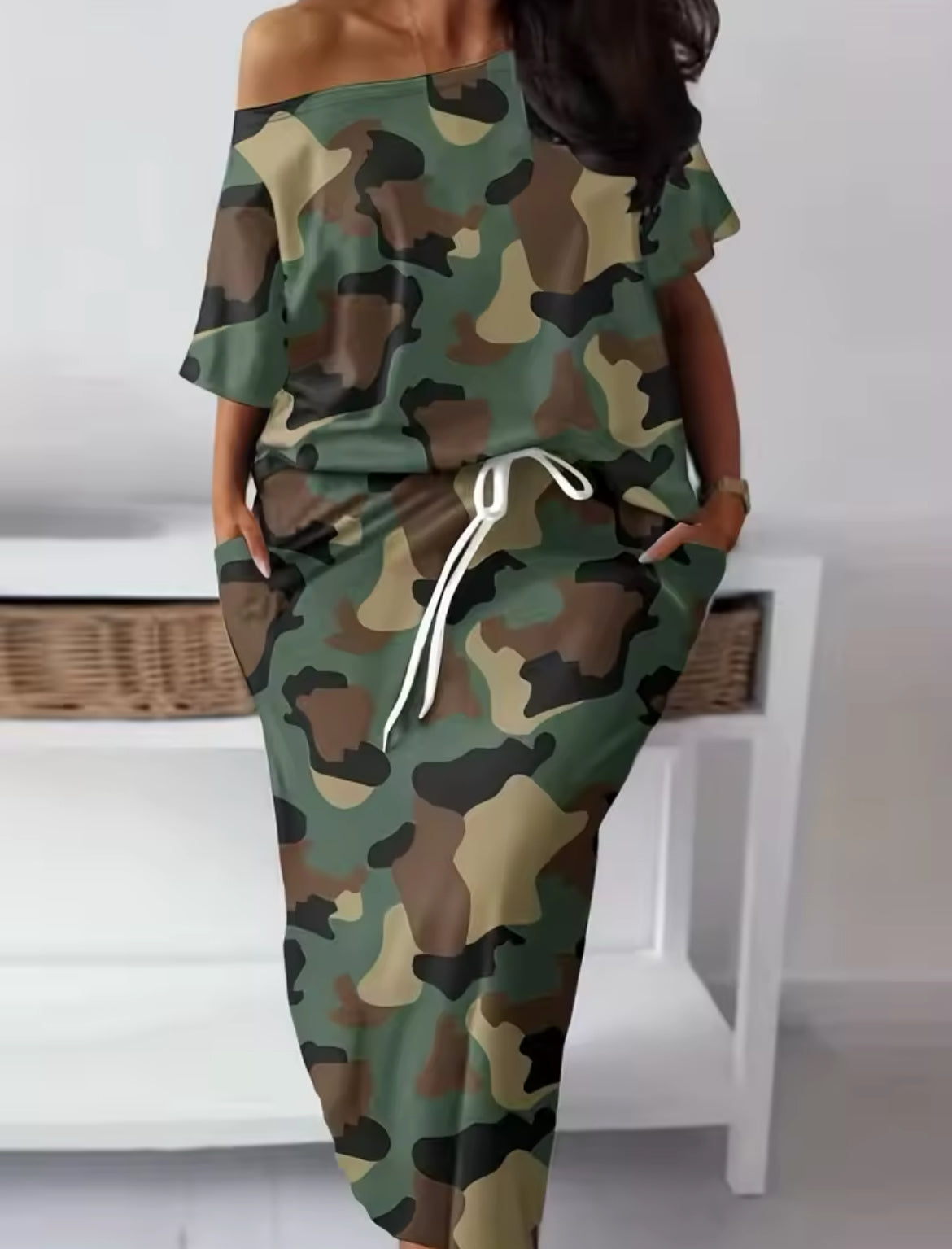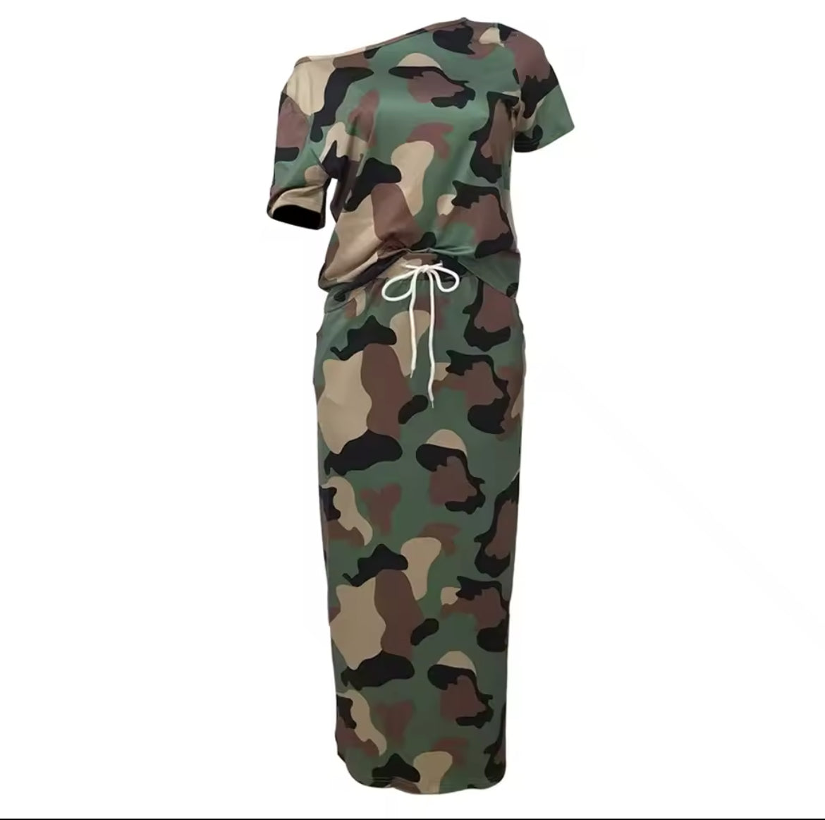 This 2-piece camo skirt set offers a bold and trendy look for fashion-forward women. With a sexy camouflage print, perfect for summer, and an eye-catching diagonal shoulder design, this skirt suit will make you stand out in any crowd. Add this to your wardrobe for a statement-making outfit.
