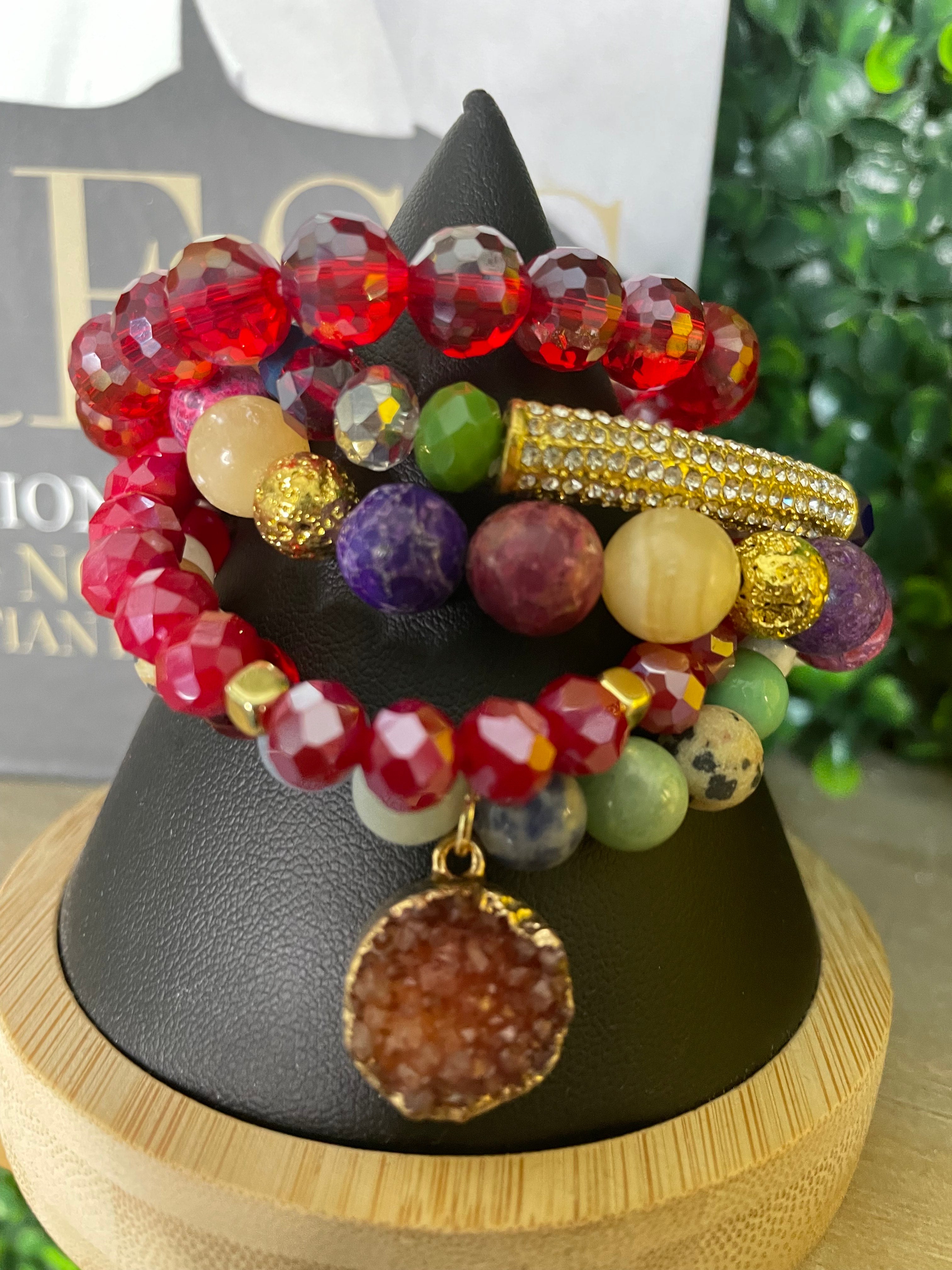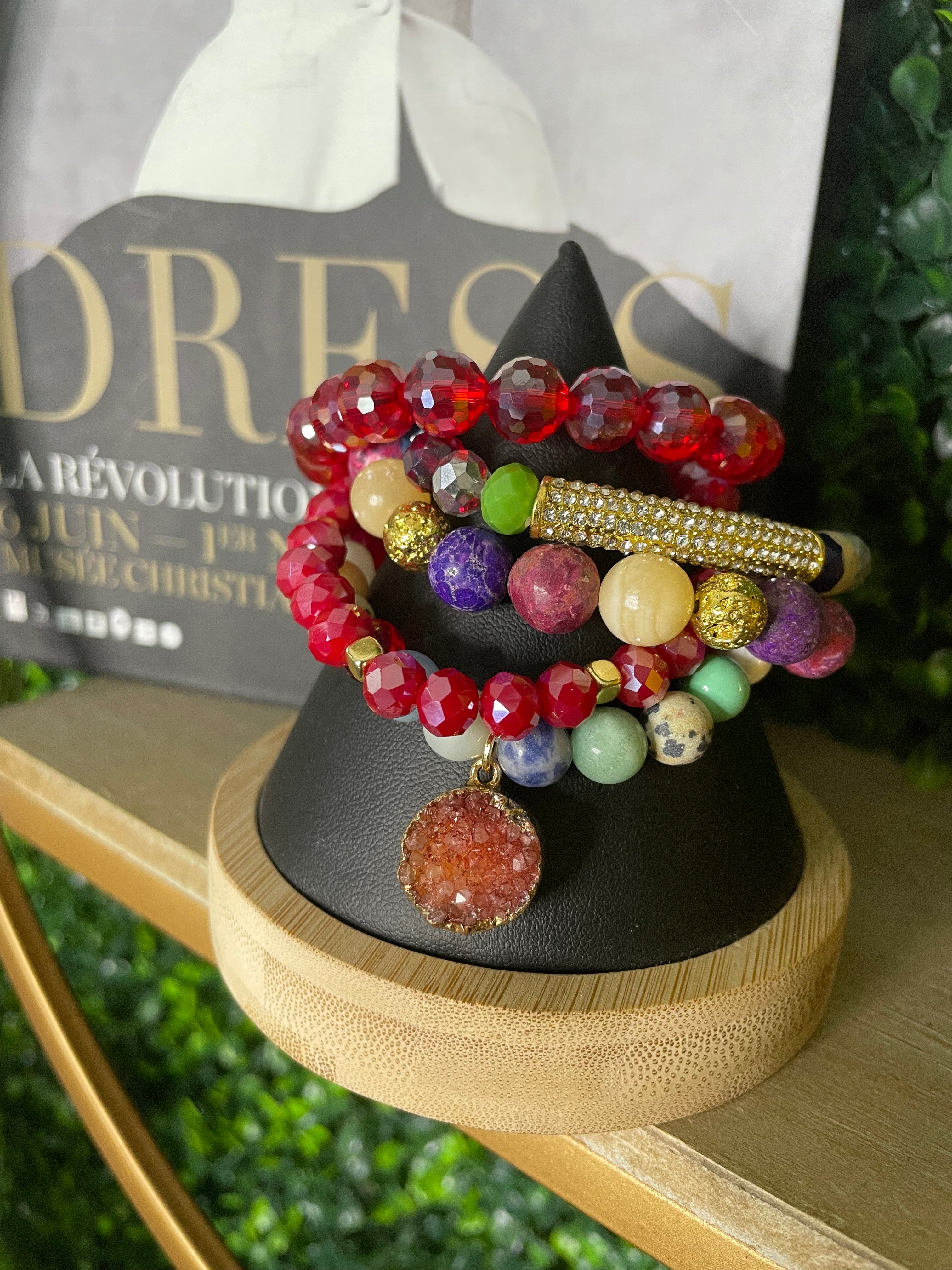Introducing our Red/Multi Bracelet Stack. Handcrafted with contrasting red and multi-colored beads, this stack is perfect for adding a pop of color to any outfit. The versatile design allows for multiple styling options, making it a must-have accessory for any fashion-forward individual. Elevate your look with our Red/Multi Bracelet Stack.